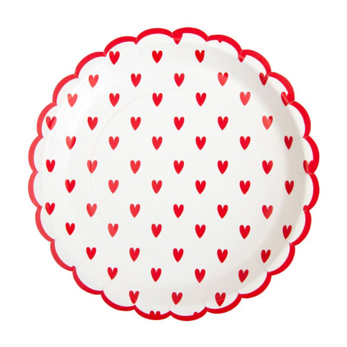 Ces jolies Assiettes jetables sont en carton blanc, imprimées d'une multitude de petits coeurs rouges. Il s'agit des assiettes jetables de forme de ronde. Ces assiettes blanches ont un liseret rouge tout autour. La ligne de ces assiettes carton apportera du romantisme à vos tables de fête, elles sont particulièrement adaptées pour vos tables de Saint Valentin. . Ces assiettes coeurs de 350gr seront parfaites pour un diner en amoureux