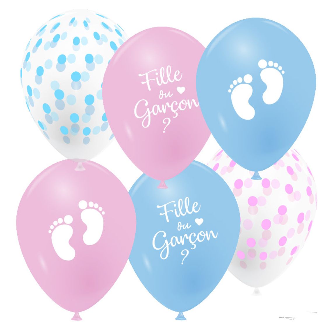 Ce lot de Ballons gender party est un assortiment de ballons sur le thème naissance, pour annoncer le sexe de votre futur bébé. Ces ballons sont 100% biodégradable et en 100% Latex. Ces ballons aux couleurs douces, sont porteurs de messages conçus pour une Gender party. : "fille ou garçon ?" Chaque ballon est imprimé sur une face avec une impression différente. Ce lot d e 6 ballons latex vous permettra de réaliser un beau bouquet pour annoncer la naissance de votre bébé, ou vous pourrez aussi l'offrir à votre amie qui vous invitera à la gender partie de son futur bébé.