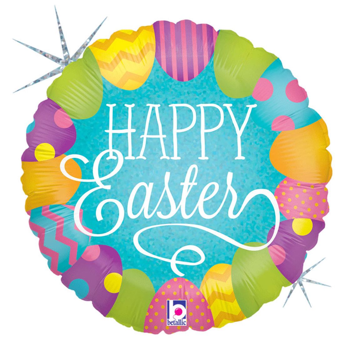 Voici plein d'Oeufs de paques réunis pour un joli ballon rond en aluminium aux couleurs vives et printanières, pour vous aider à décorer vos vitrines, vos maisons, vos magasins, ou toutes les autres salles pour annoncer la fête de pâques. Vous pourrez offrir ces ballons aux enfants pour leurs souhaiter de joyeuses fêtes de pâques. Allez vite cacher les oeufs, pour voir des étoiles dans les yeux de tous.