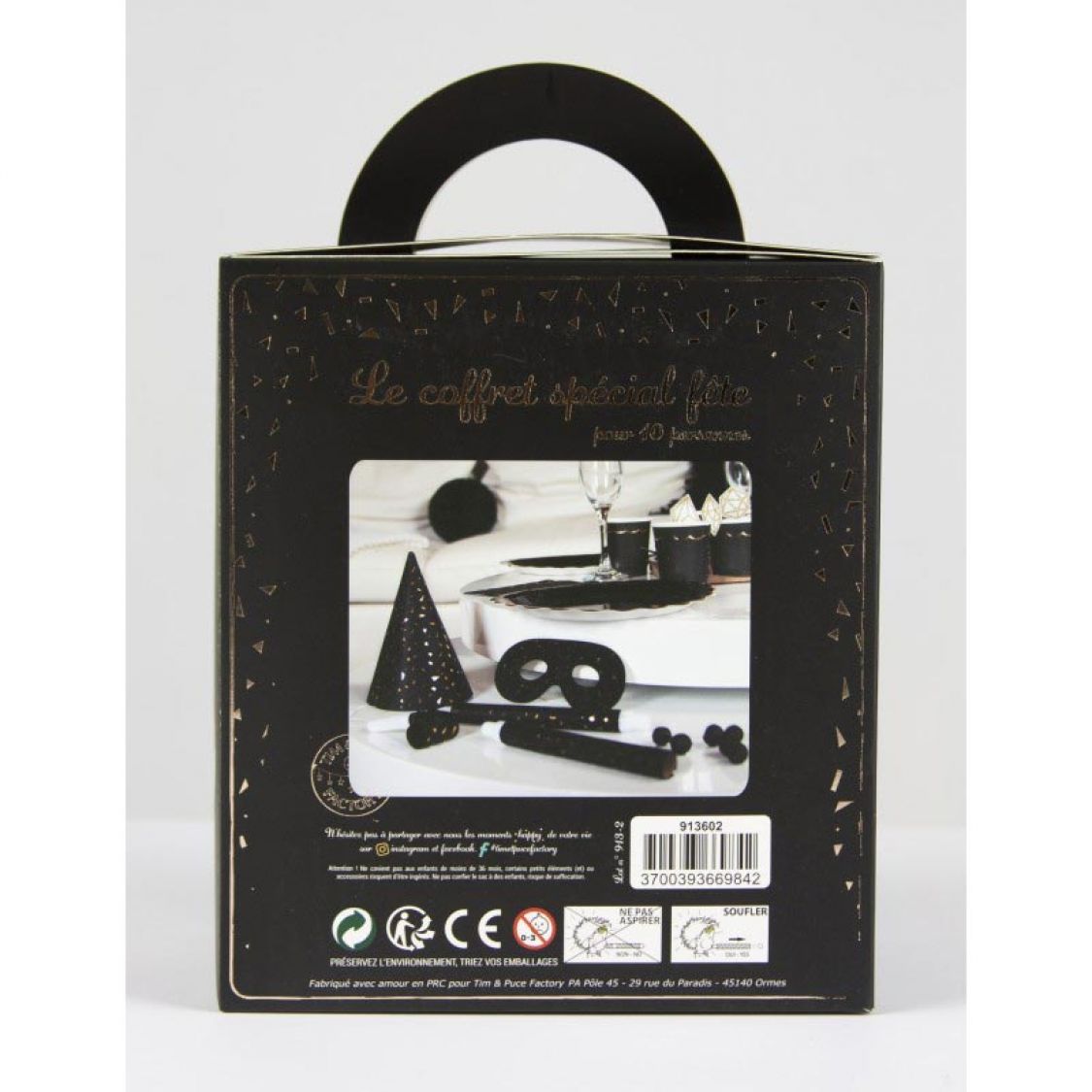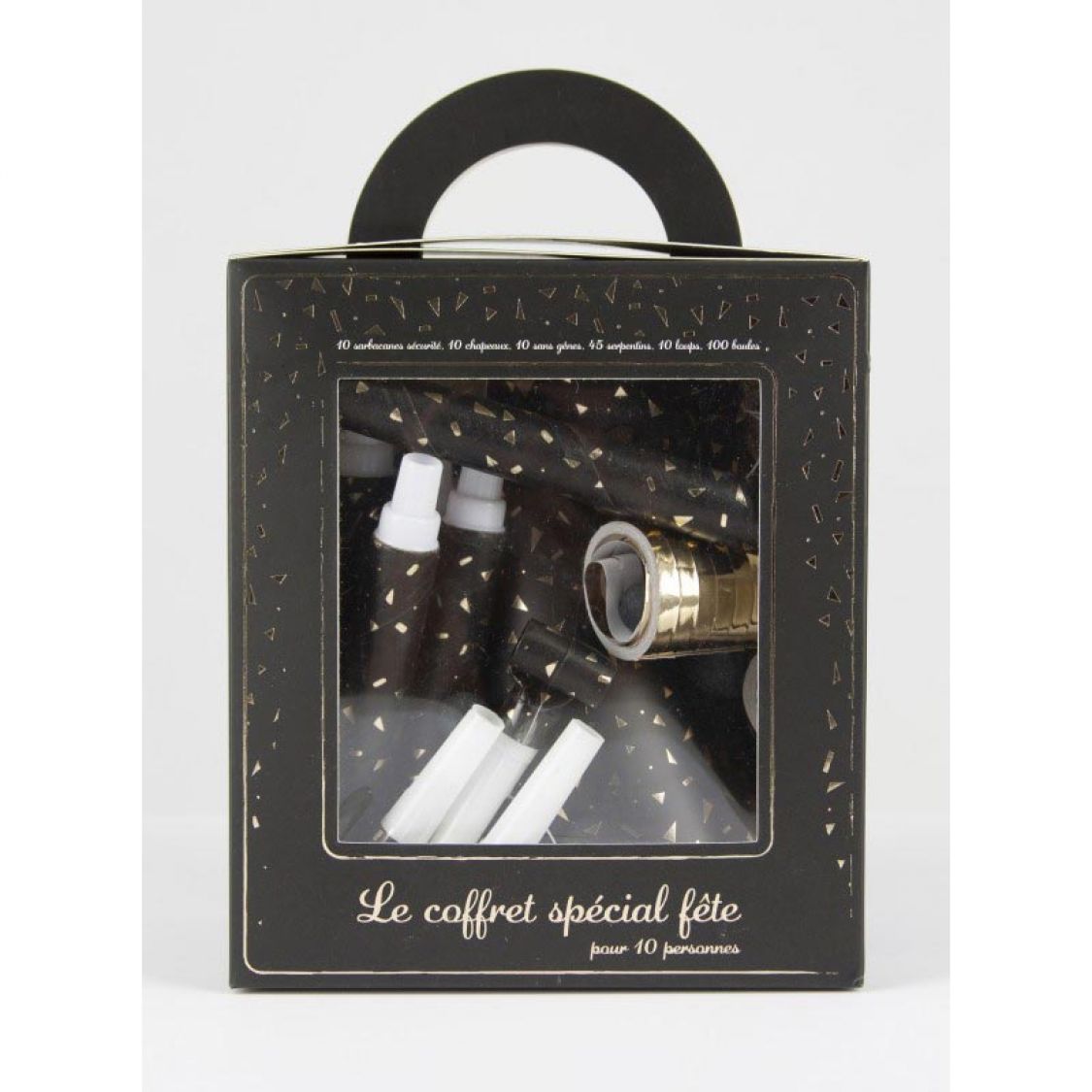 Anniversaire, fête de fin d'année, Noël,kermesse, carnaval ou tout simplement l'envie de s'éclater entre amis, lvoici une belle boite de cotillons aux coloris Noir et or. Cette jolie présentation se compose de 10 sarbacanes, 100 boules dancing, 10 sans genes, 45 serpentins, 10 loups, le tout dans des couleurs chics et élégantes..