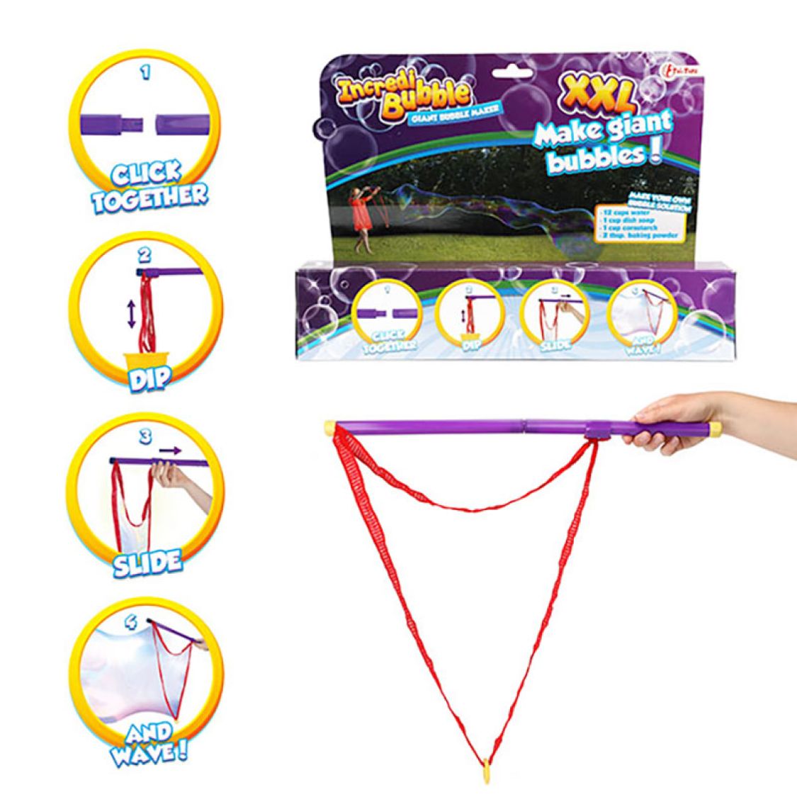 Grâce à ce jeu les enfants pourront réaliser un maximum de bulles géantes ! Avec ce kit, vous épaterez tout le monde en réalisant d'énormes bulles. Pour cela il vous suffira de tremper l'accessoire de bulles de savon dans du liquide et ensuite vous pourrez former des bulles géantes ! Voici une super animation pour mettre en place un atelier pour un stand de kermesse ou à l’occasion toutes les fêtes en plein air ou un goûter d'anniversaire.