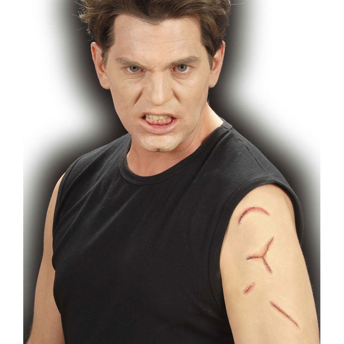 Ce kit de maquillage est un maquillage pour adulte qui est composé de 4 fausses plaies avec de la colle liquide. Ces fausses plaies sont de taille et de forme différentes , elles représentent des cicatrices recousues. Ces fausses cicatrices sont fournies avec 2 sachets de colle 1,5 ml chacun. La colle permet de fixer facilement la cicatrice sur votre peau , il vous suffit de déposer de la colle sur les fausses cicatrices et d'attendre quelques secondes puis d'appliquer la cicatrice sur votre peau.