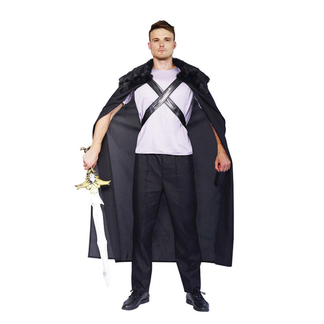 Ce Costume adulte médiéval noir est un déguisement pour homme de couleur noire, qui vous permettra de vous transformer en chevalier médiéval ou en viking, pour participer à toutes les soirées déguisées. Cette cape noire est faite en tissu léger noir et son col est en fausse fourrure. Cette longue cape s'enfile aisément, elle est ornée sur son devant avec 2 bandes en simili, effet cuir noir. Ces deux bandes sont croisées , ce qui rend le costume plus authentique. Portez cette cape avec fourrure pour une soirée à thème médiéval ou encore une réception à thème Game of Throne. Vous etes convié à une soirée à thème série télévisée , et bien choisissez pour cette cape.