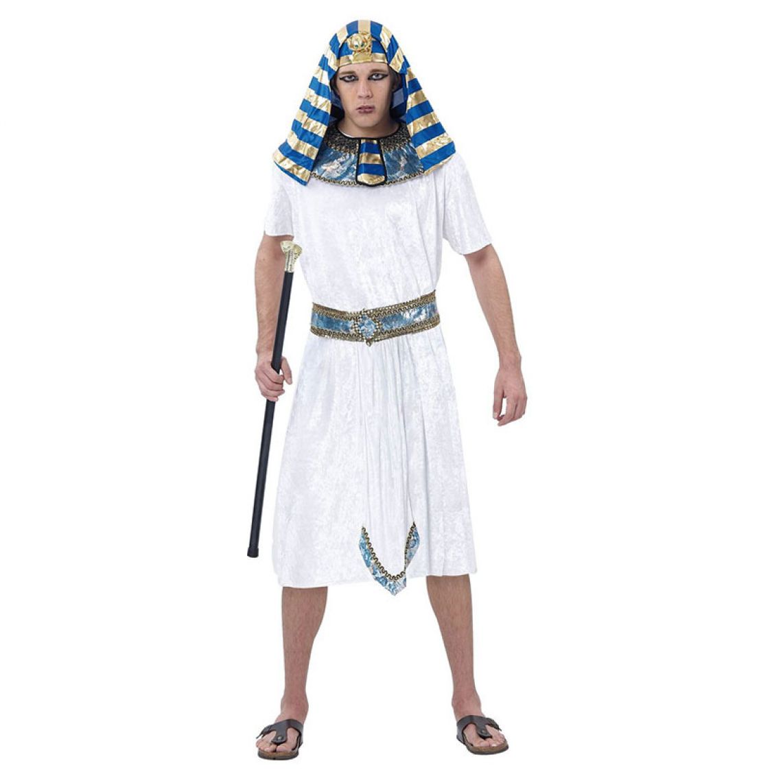 L'ère des pharaons sera représentée par le Costume égyptien. Vous inspirerez le pouvoir avec le déguisement égyptien composé d'une tunique blanche, d'un ras de cou, d'une ceinture et d'une coiffe royale rappelant le célèbre Toutankhamon, à rayures or et bleu. Avec le Costume égyptien vous retrouverez le grand sphinx et les pyramides remplies de mystères. Ce déguisement est idéal pour les soirées à ou tour du monde entre amis