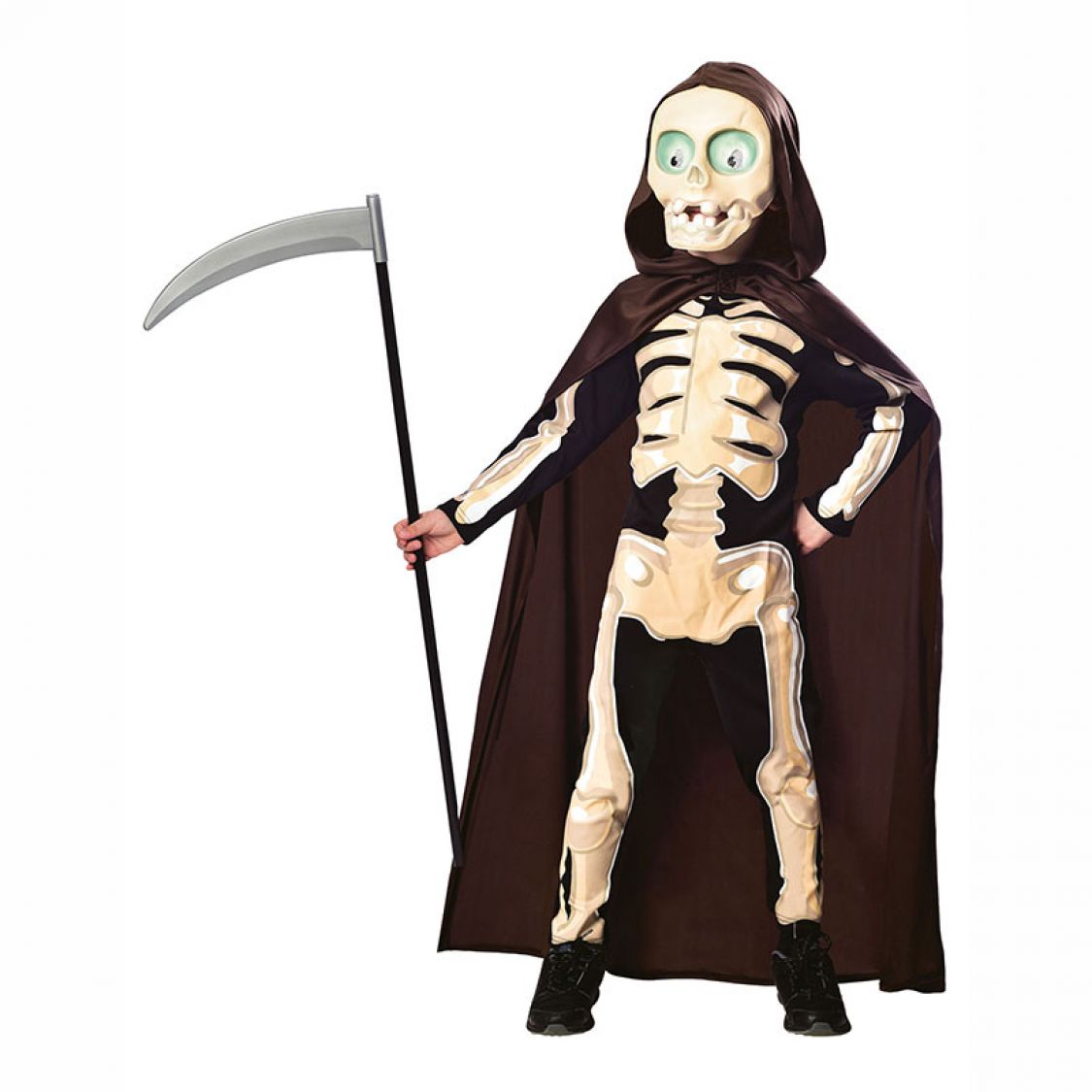 Pour Halloween nous vous proposons ce beau déguisement faucheuse luxe. Ce costume terrifiant et mystérieux est complet, il est composé d'une combinaison, noire imprimée squelette, d'une cape marron à capuche et d'un masque squelette. Avec ce beau déguisement votre enfant va pouvoir récolter énormément de bonbons le soir du 31 Octobre, en allant de maison hantée en maison hanté.