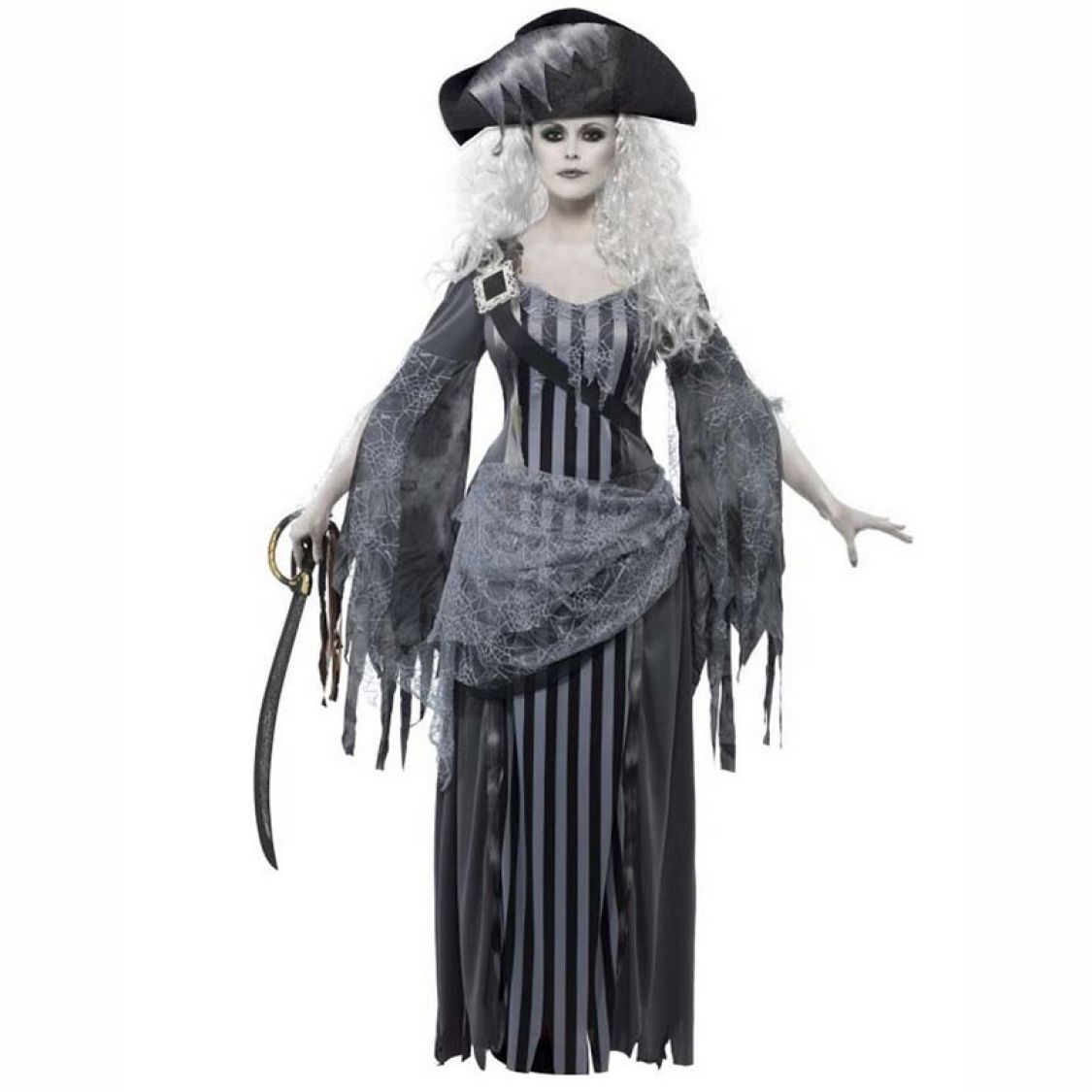 Sombre, lugubre et mystérieuse seront vos caractéristiques le temps d'une soirée avec ce déguisement Lady Pirate de couleur noir et gris. ! Enfilez ce magnifique déguisement de Lady aux lignes somptueuses gothique composé d'une robe longue et d'un chapeau Pirate, et vous pourrez incarner une pirate de l'au-delà . Ce déguisement de fantôme Pirate pour femme sera idéal pour participer à une soirée d'Halloween, il pourra aussi etre utilisé comme costume de théâtre, ou encore pour un Carnaval ou un Bal Costumé...