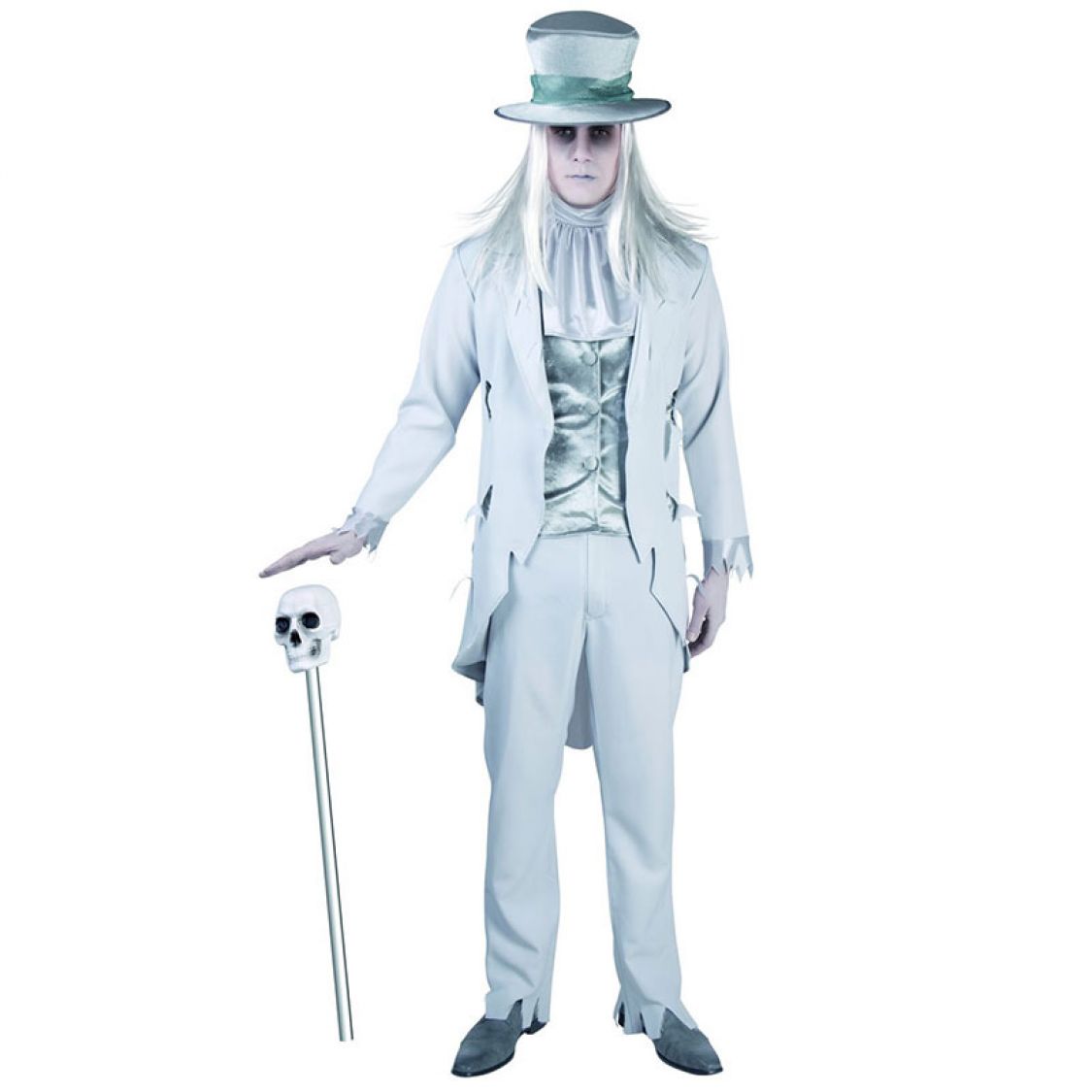 Ce déguisement de marié fantôme est de couleur gris et argent, il se compose d'un pantalon gris avec un élastique, un gilet en velours et d'une veste longue. Dans ce costume est aussi inclus un chapeau avec des cheveux blancs et une collerette. Pour la soirée d'Halloween devenez un Marié d'outre tombe ! Dans tous les défilés il y a des mariés, alors soyez un marié mystérieux pour toutes les soirées à thème épouvante. Ce déguisement est complet , il vous permettra de bluffer vos aùis.