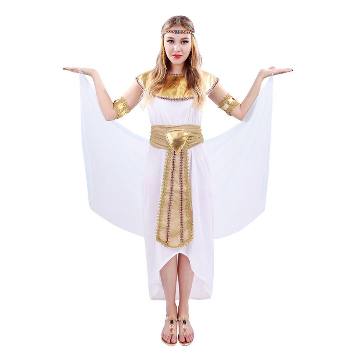Faites revivre l'ère des pharaons avec ce Costume de Reine Egyptienne ! Vous allez faire un clin d'oeil au Pyramides, juste en enfilant ce costume d'Egyptienne. Ce déguisement egyptien est composé d'une robe blanche ornée d'une ceinture et d'un col doré. Pour donner la touche final 2 manchons et une coiffe sont également fournis. Avec le costume Egyptien vous vous retrouverez au temps du Grand sphinx, de l'Egypte et de ses mystères.