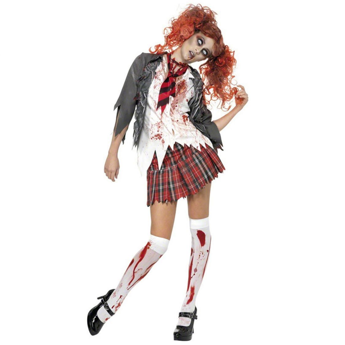 Ce déguisement zombie écolière est un déguisement pour femme qui sera tout à fait adapter pour aller célébrer Halloween. Ce costume sanglant se compose d'une veste qui a des manches 3/4 avec un chemisier blanche intégrée coupée pour donner un effet déchiré. Cette tenue Halloween comprend aussi une jupe écossaise avec un élastique à la taille et pour compléter le tour il y a une cravate rouge et noire . Ce déguisement est de de bonne qualité et il sera parfait pour faire frémir tous le monde à l'occasion d'une soirée "horreur" .