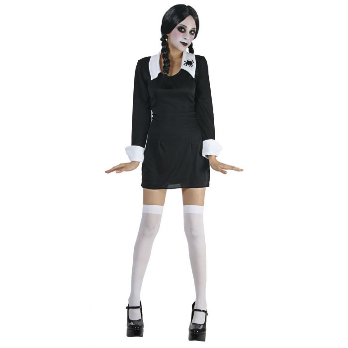 Pour fêter Halloween, incarnez une sombre écolière en imitant Mercredi qui est un des personnages du Film "La Famille Adams". Ce déguisement d'écolière sera aussi bien adapté rfait pour une soirée à thème d'épouvante, gothique, pour un un carnaval , ou une soirée déguisée. Ce costume d'écolière gothique est composé d'une robe courte noire, avec un col et des poignets blanc, et avec une araignée noire sue le col. Devenez une écolière des ténèbres pour toutes les fêtes de l'horreur et particulièrement pour le soir d'Halloween
