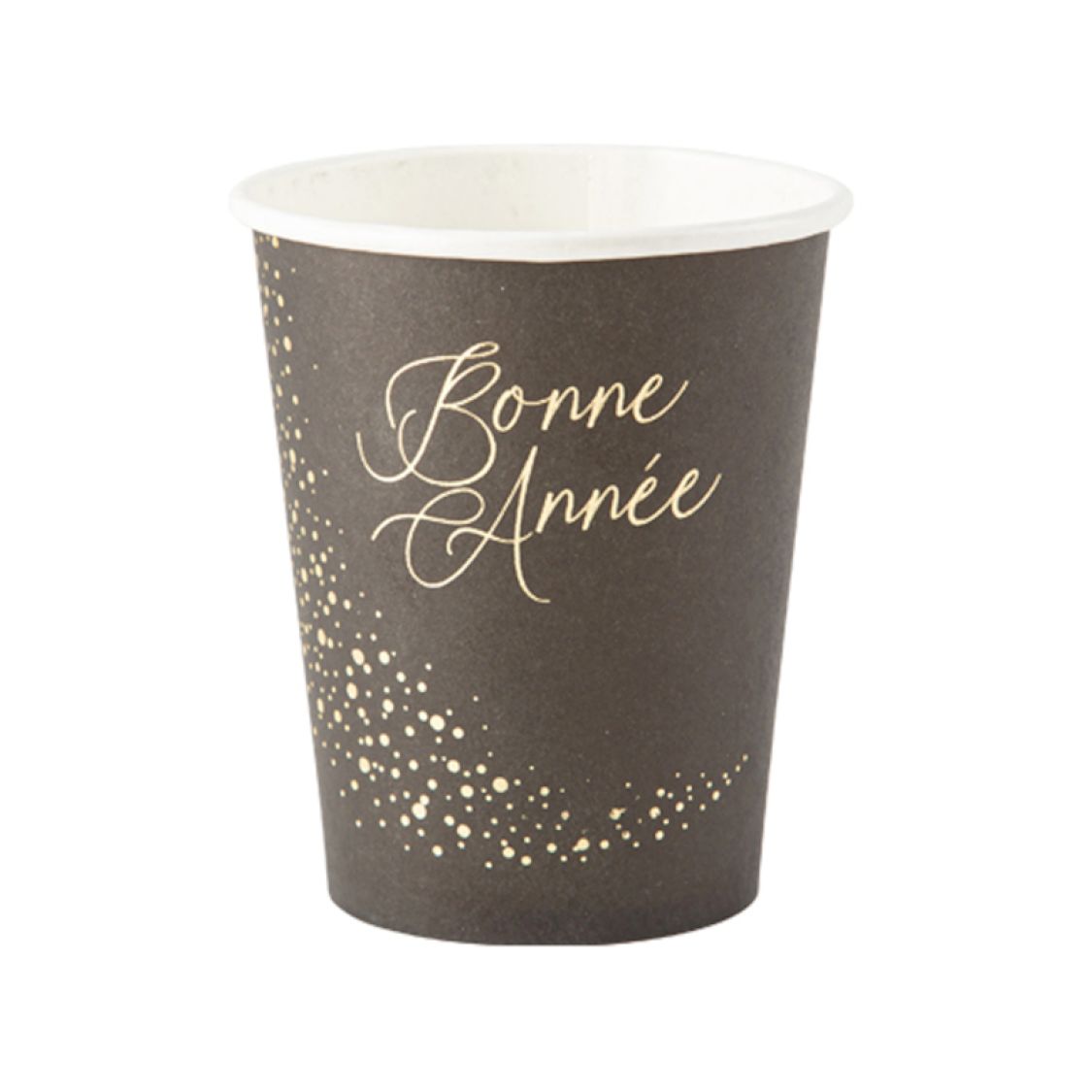 Voici de jolis verres jetables de couleurs noires et or. Ces verres en carton sont imprimées "Bonne Année". Ces gobelets carton trouveront facilement leur place sur les tables ou les buffets de vos fêtes de fin d'année. Ces gobelets seront parfaits pour tous vos décors de table sur les thèmes nouvel an