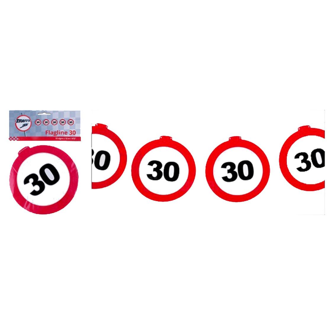La guirlande anniversaire effet panneau de signalisation est composé de fanionsrond reprsentants des panneaux de circulation. Sur chaque fanion rond, est imprimé un chiffre, cette guirlande existe pour chaque dizaine à célébrer. Ainsi vous pourrez utiliser cette guirlande anniversaire pour le déco de votre fête d'anniversaire pour célébrer un âge important. Cette guirlande cartonnée est composée de 15 panneaux de 20cm de diamètre environ . Cette guirlande se mariera avec toutes sortes de décors.