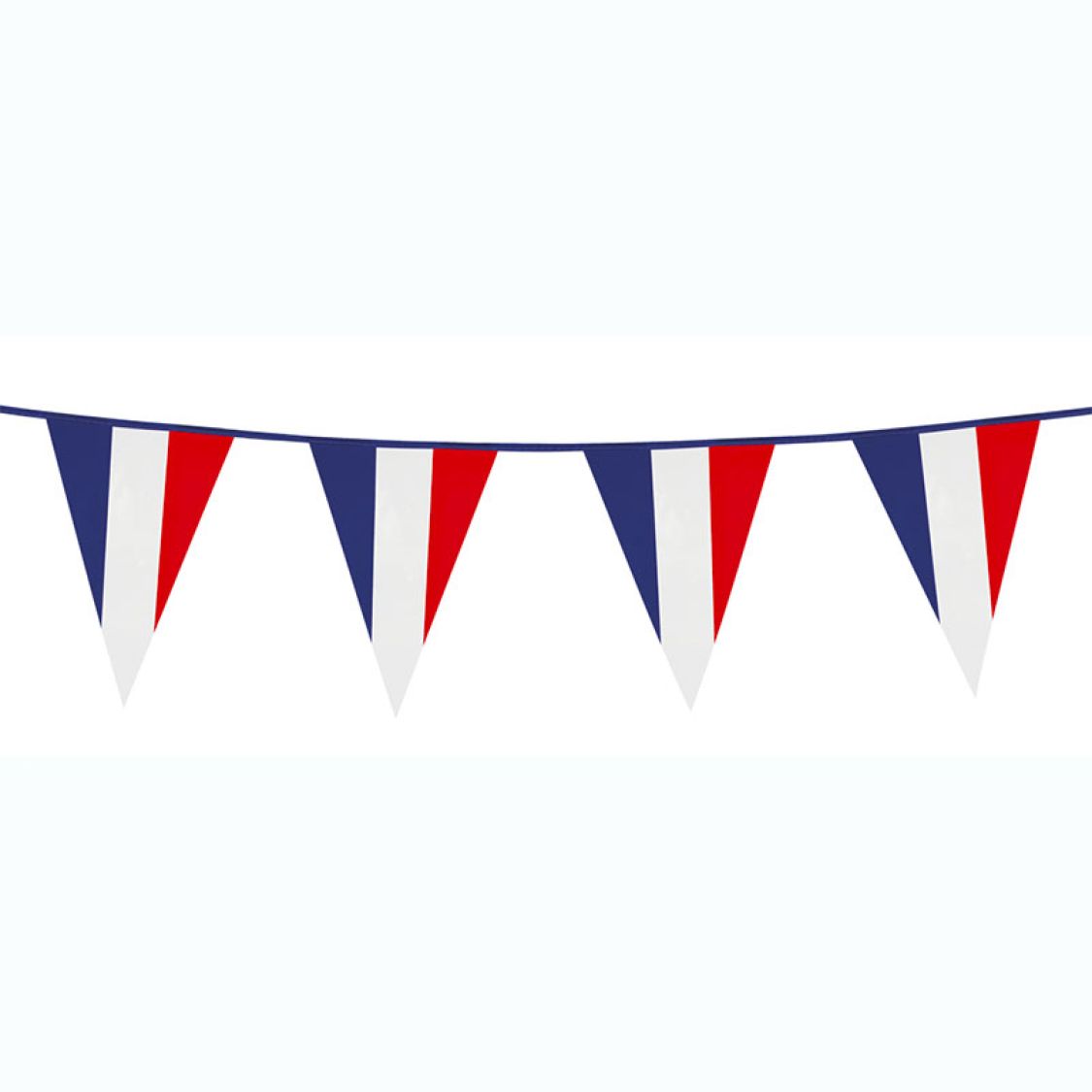 Cette guirlande fanions est aux couleurs de la France. Il s'agit d'une guirlande plastique avec des fanions triangles d'environ 5 metres de long, les fanions sont de couleurs bleu, blanc, rouge qui mesurent chacun 21 cm de large et 30 cm de haut. Ces petits triangles à l'effigie de la France, vous permettront de décorr tous vos espaces, soit pour jouer les supporters pour toutes les compétitions où la France est représentée. Cette guirlande de la France pourra aussi vous servir à orner tous les évènements nationaux.