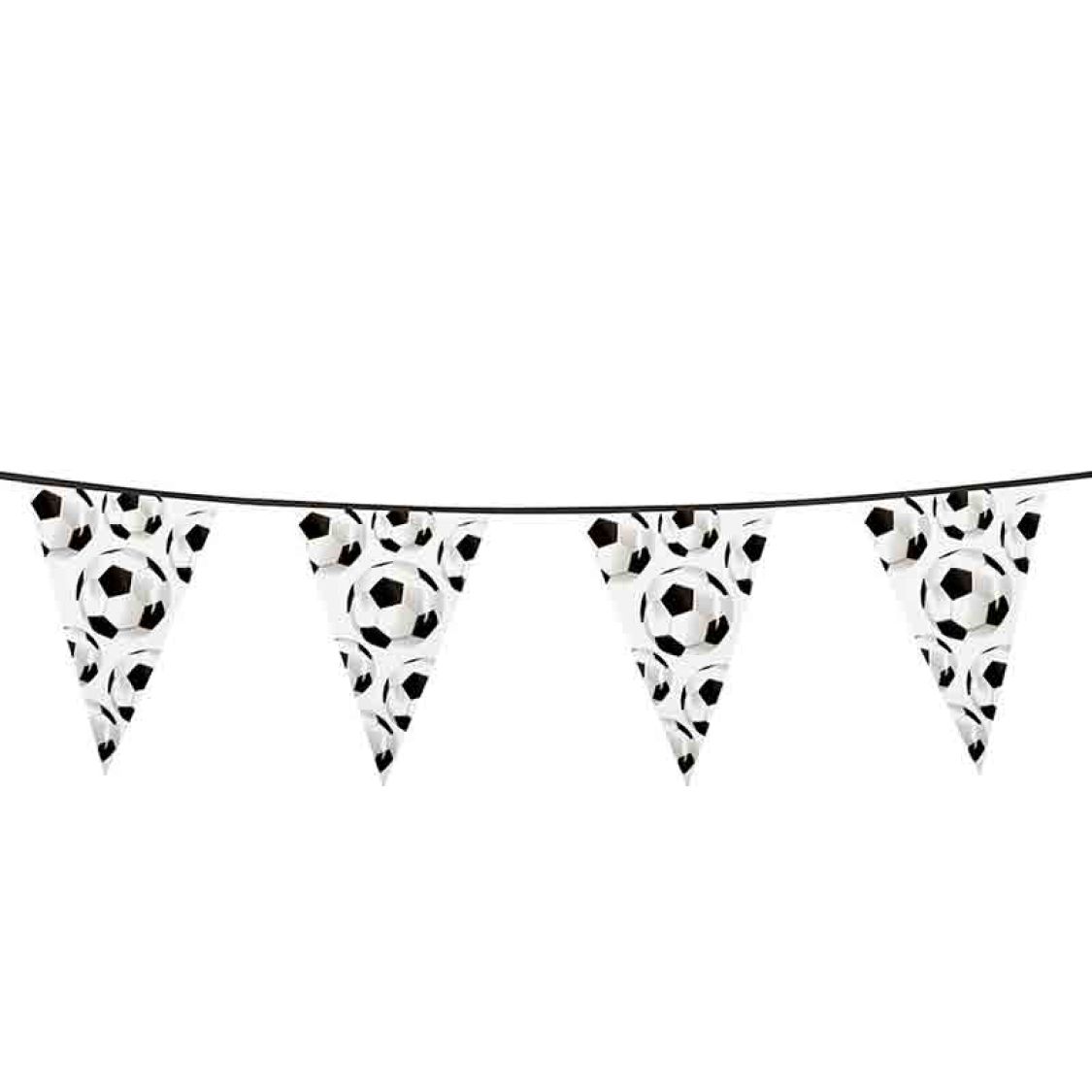 Avec cette guirlande foot, composée de fanion triangle, vous allez faire régner une ambiance football ! Chaque fanion en carton de ,cette guirlande de 6 metres, mesure 20cm x 30cm. La guirlande foot est imprimée en noir et blanc ce qui rapelle le ballon de foot. Vous pourrez utiliser cette guirlande football pour toutes vos soirées match entre amis, votre soirée à thème sport ou foot.