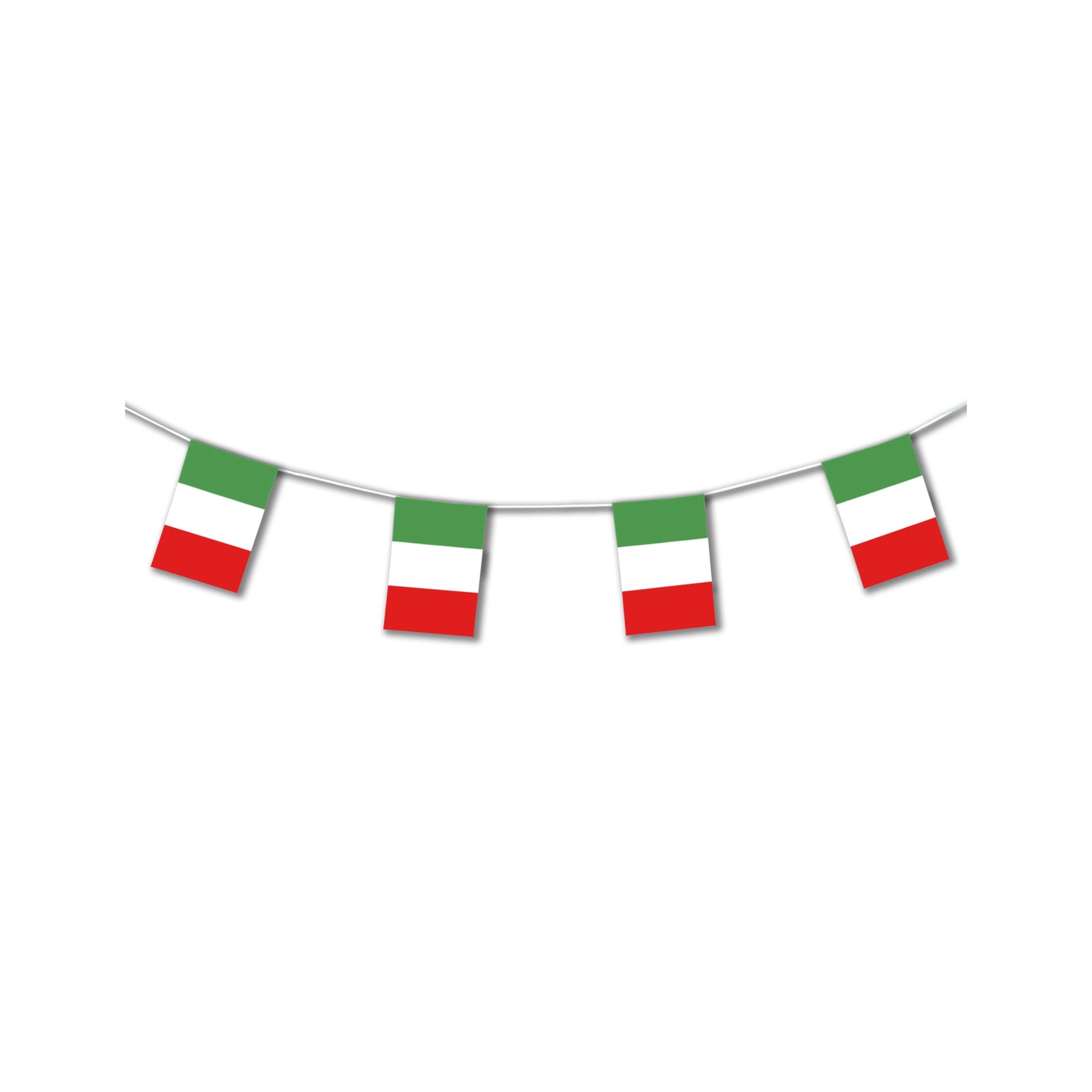 Cette guirlande fanions est aux couleur de l'Italie . Il s'agit d'une guirlande plastique d'environ 5 metres de long, composée de fanions rectangles vert, blanc, rouge. Ces petits drapeaux à l'effigie de l'Italie, vous permettront de décorez tous vos espaces, soit pour jouer les supporters pour toutes les compétitions où l'Italie est représentée. Cette guirlande de l'Italie pourra aussi vous servir à orner tous les évènements nationaux.