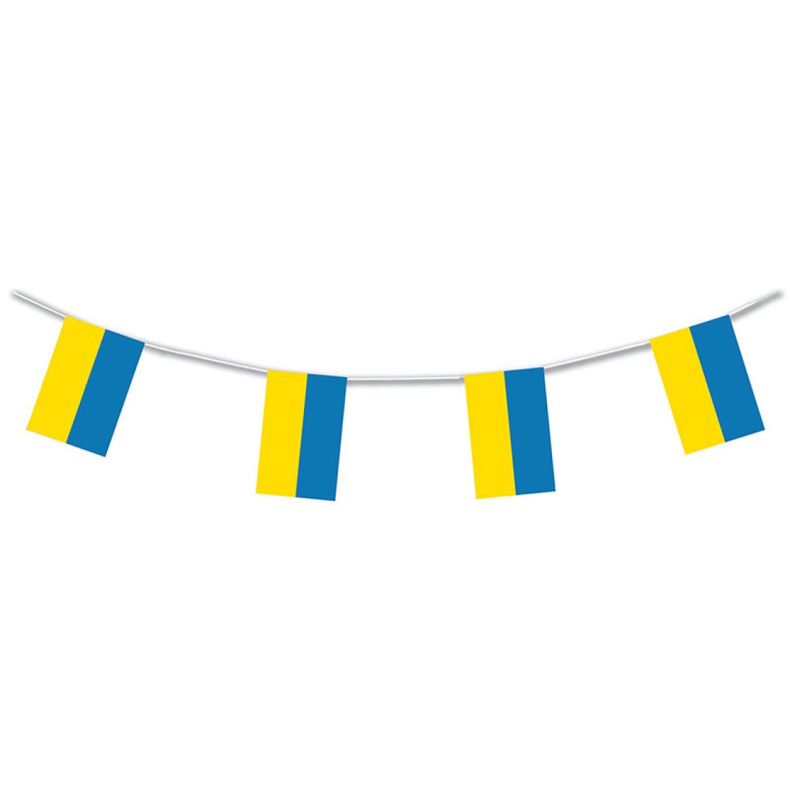 Cette guirlande fanions est aux couleur de la Ukraine. Il s'agit d'une guirlande plastique d'environ 10 metres de long, composée de fanions rectangles bleu et jaune Ces petits drapeaux à l'effigie de l'Ukraine, vous permettront de décorez tous vos espaces, soit pour jouer les supporters pour toutes les compétitions où l'Ukraine est représentée. Cette guirlande Ukrainienne pourra aussi vous servir à orner tous les évènements nationaux.