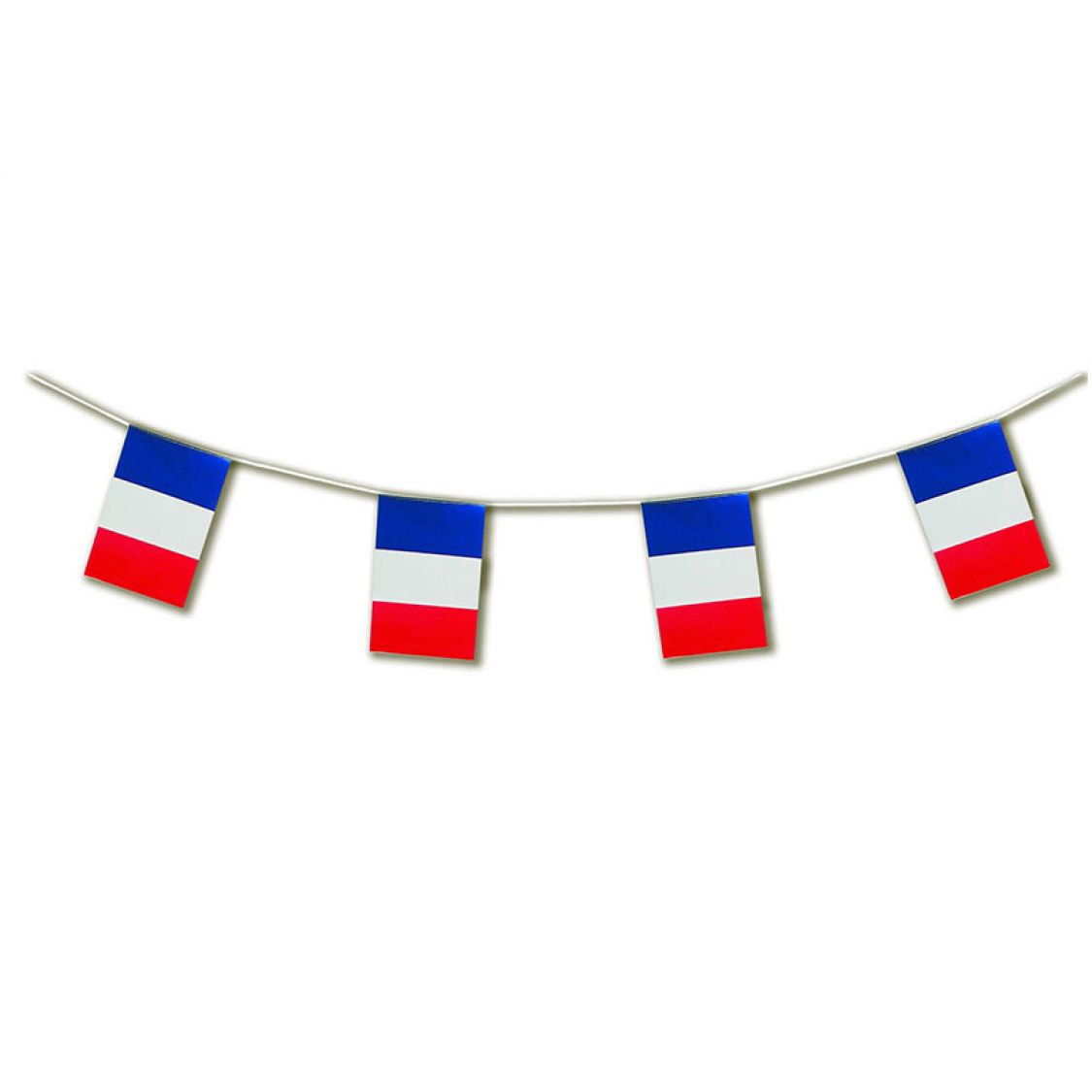 Cette guirlande fanions est aux couleur de la France. Il s'agit d'une guirlande plastique d'environ 5 metres de long, composée de fanions rectangles bleu, blanc, rouge. Ces petits drapeaux à l'effigie de la France, vous permettront d edécorez tous vos espaces, soit pour jouer les supporters pour toutes les compétitions où la France esst représentée. Cette guirlande de la France pourra aussi vous servir à orner tous les évènements nationnaux.