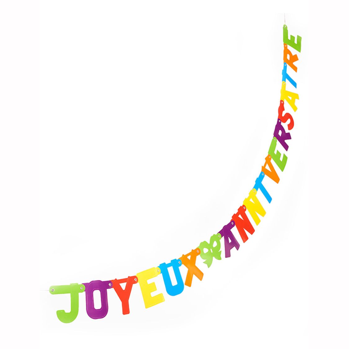 Cette guirlande colorée transmet le message "Joyeux Anniversaire". Cette guirlande Anniversaire mesure environ 2m de longueur. Les lettres sont découpées, et s'articulent grâce aux oeuillets, et 2 petites ficelles sont de part et d'autre pour suspendre la guirlande. Cette guirlande sera parfaite pour décorer votre salle de fête et mettre de la couleur pour votre fête d'anniversaire.
