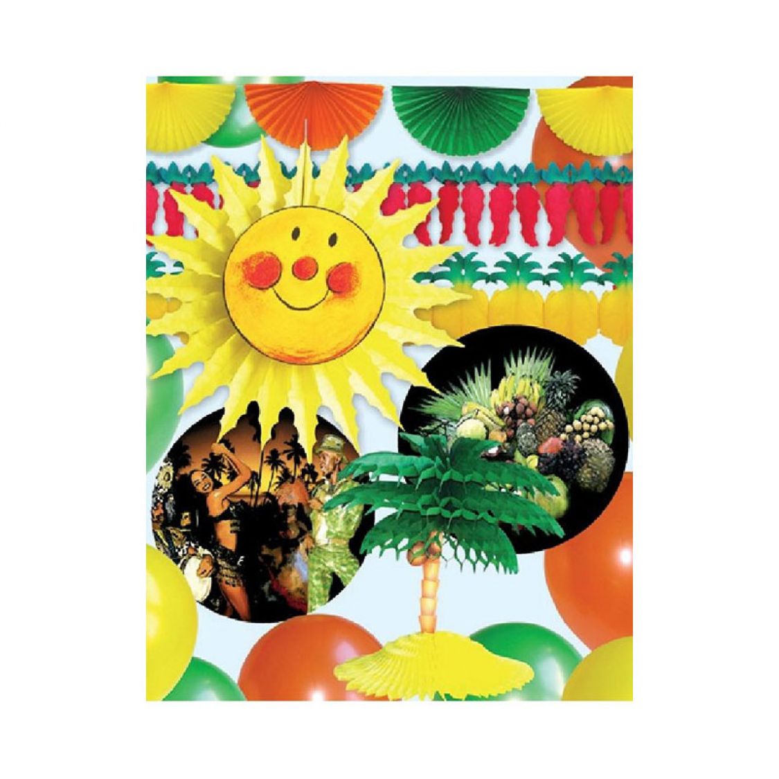 Composition : 1 éventail soleil 66 cm, 1 guirlande piment 4 m, 1 guirlande, 7 éventails jaune/orange/vert, 1 guirlande ananas 4 m, 1 palmier (prédécoupés avec danseurs et fruits exotique),10 ballons jaune/vert/orange