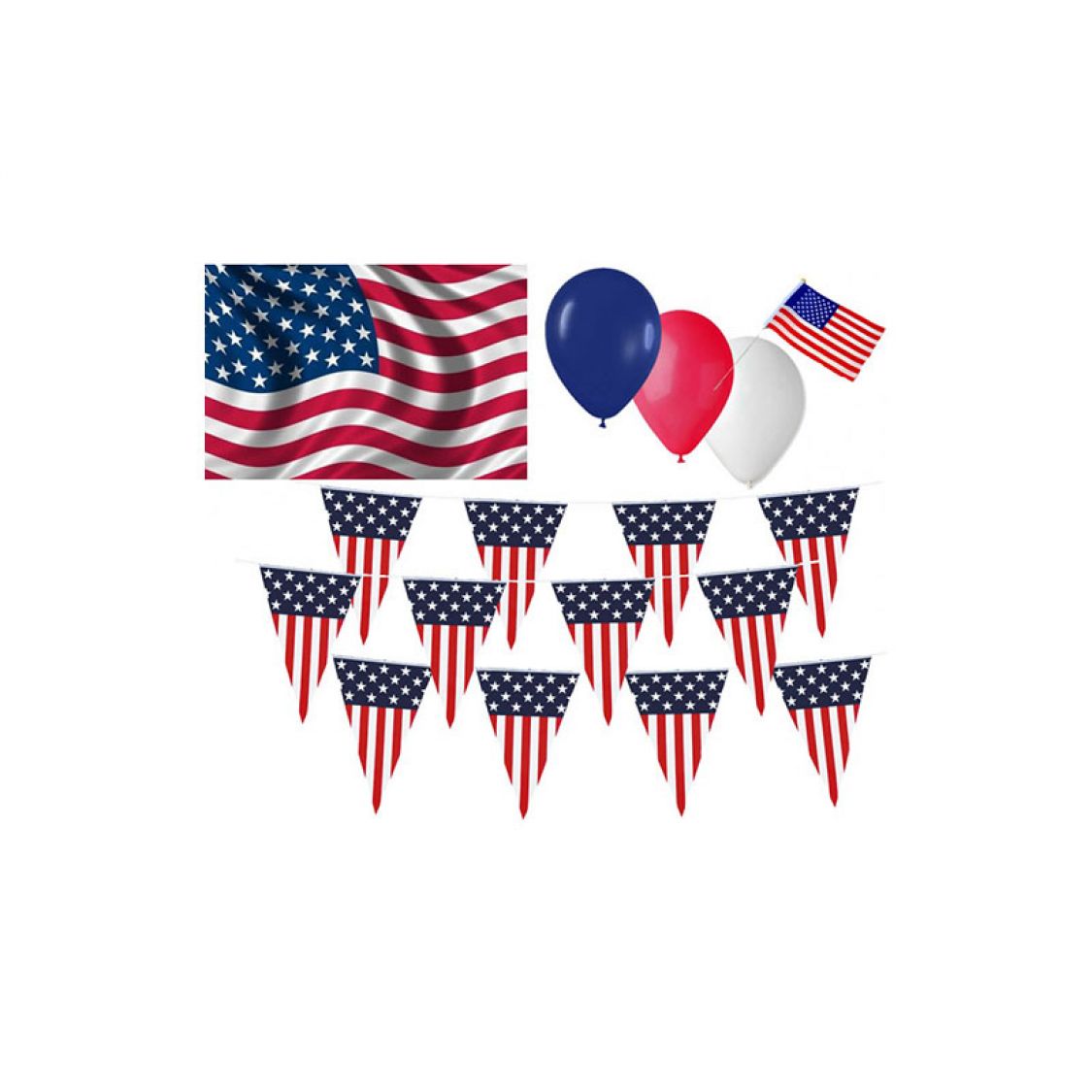 Composition : 20 mini drapeaux USA, 20 ballons rouge,20 ballons bleu, 20 ballons blanc, 3 guirlandes 15 pavillons Usa 6m,1 drapeau Usa 90x150cm