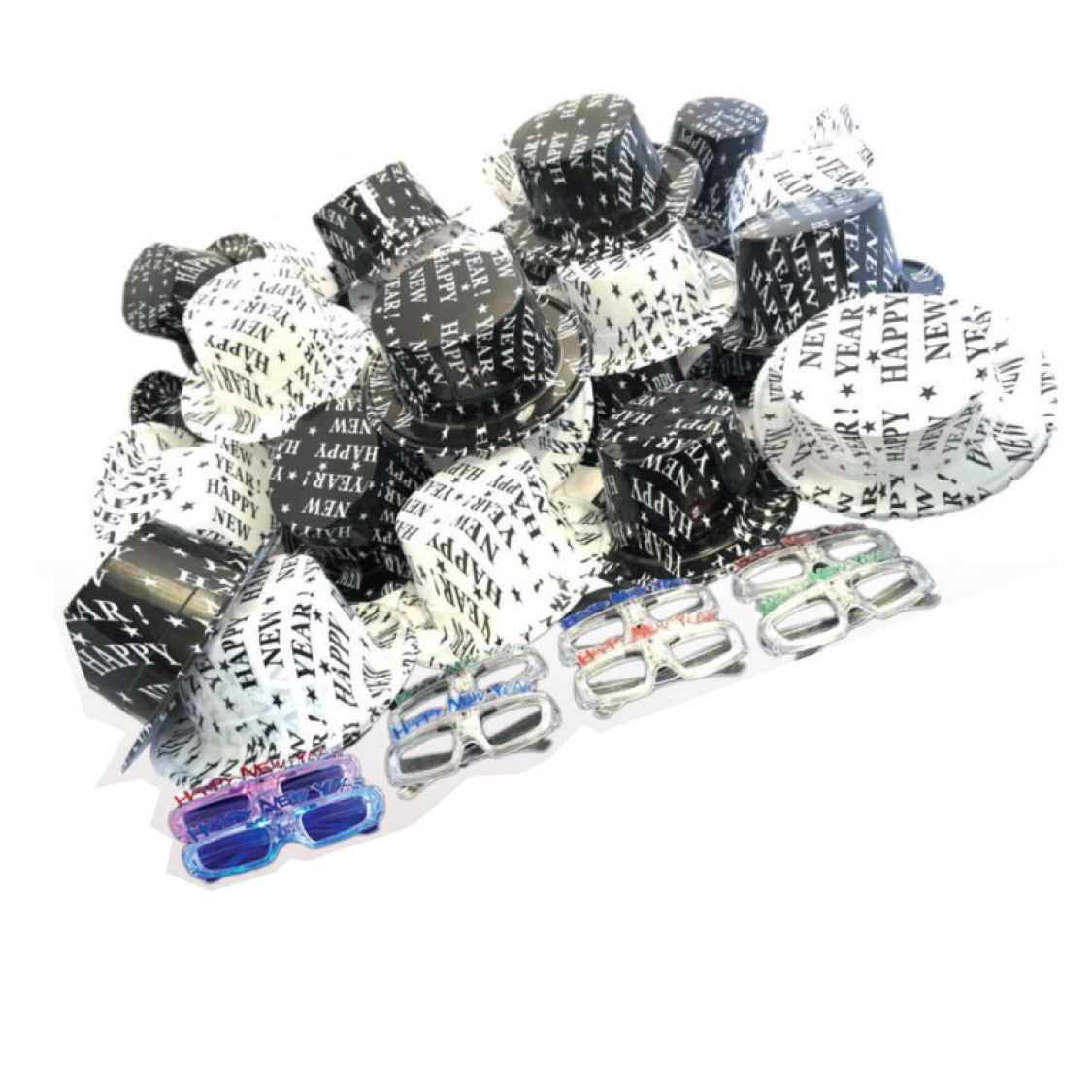 Conditionnement: Lot comprenant : 24 chapeaux haut de forme noir, 24 chapeaux haut de forme blanc, 8 paires de lunettes Happy New Year Lumineuses