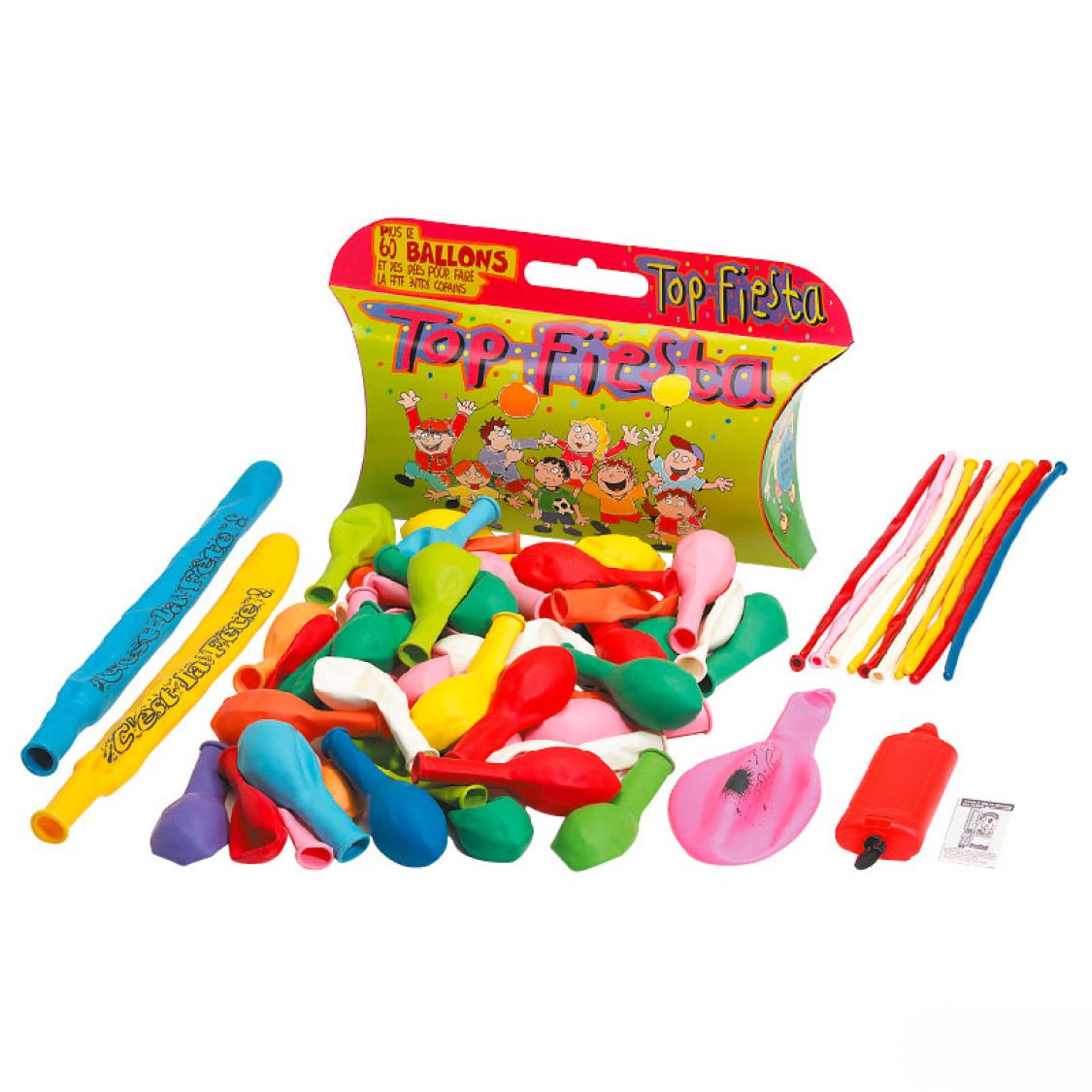Conditionnement : Mallette Top Fiesta comprend2 ballons bannière 1,30 mètre de long imprimés "C'est la fête", 1 ballon géant Ø 40cm imprimé "Joyeux Anniversaire", 10 ballons à sculpter, 50 ballons multicolores Ø 25 cm, 1 pompe à main et 1 livret "Astuces et idées pour décorer et s'amuser"