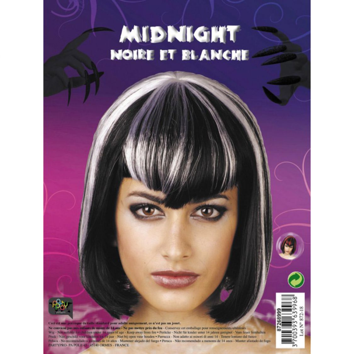 Voici une Magnifique perruque courte pour femme, carré noir et blanc avec une frange et quelques mèches blanches assorties. Cette perruque est l'accessoire idéal pour accompagner votre robe de cocktail ou lors d'une soirée déguisée, fêter Halloween ou tout autre evenement.