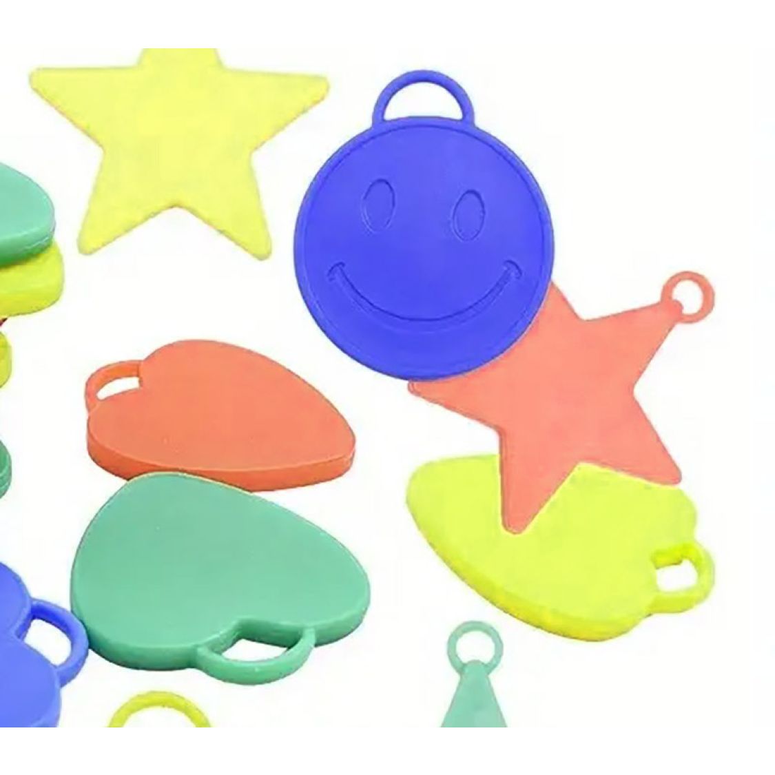 Nous vous proposons des Sachets de Poids plastique de 8gr, en forme assorties coeur, smiley et étoile . Ces poids à ballons sont proposés en couleurs vives, ils vous permettront de lester des ballons en latex ou des ballons en mylar. Chaque poids peut lester 1 ballon latex de taille classique de 28cm , ou un ballon aluminium de 45cm.