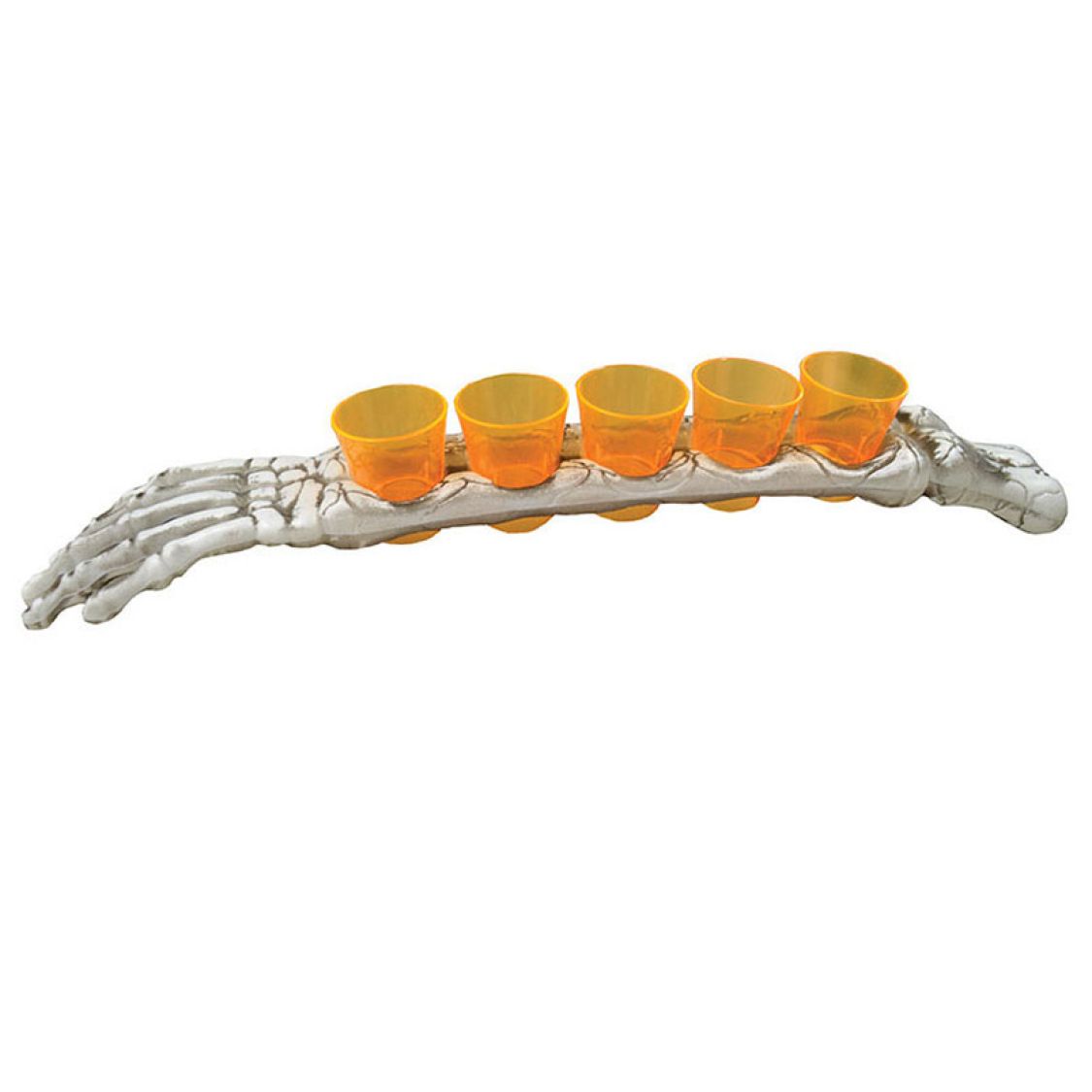 Vous voulez que votre soirée d'Halloween soit fun ? Alors choisissez ce présentoir de 5 verres à shooter. Ces schoots en plastique orange transparentont une contenance de 37 ml et sonyt présentés sur un bras de squelette qui mesure environ 48 cm de long. Vous aller pouvoir compléter votre décoration de table d'Halloween de façon originale et trinquer avec vos amis.