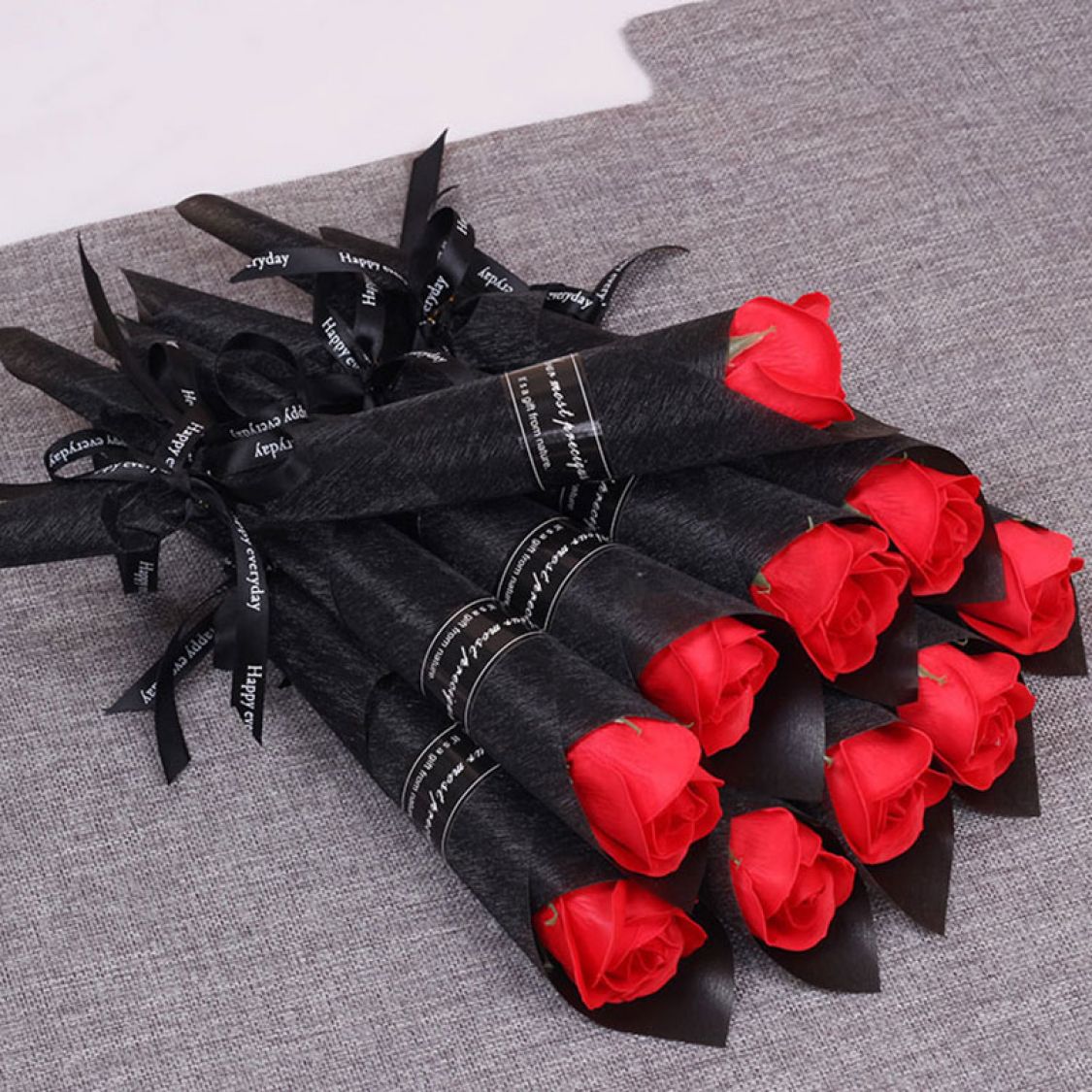 Conditionnement : A l'unité, tige en plastique, et pétales en savon emballée dans un tissus non tissé noir