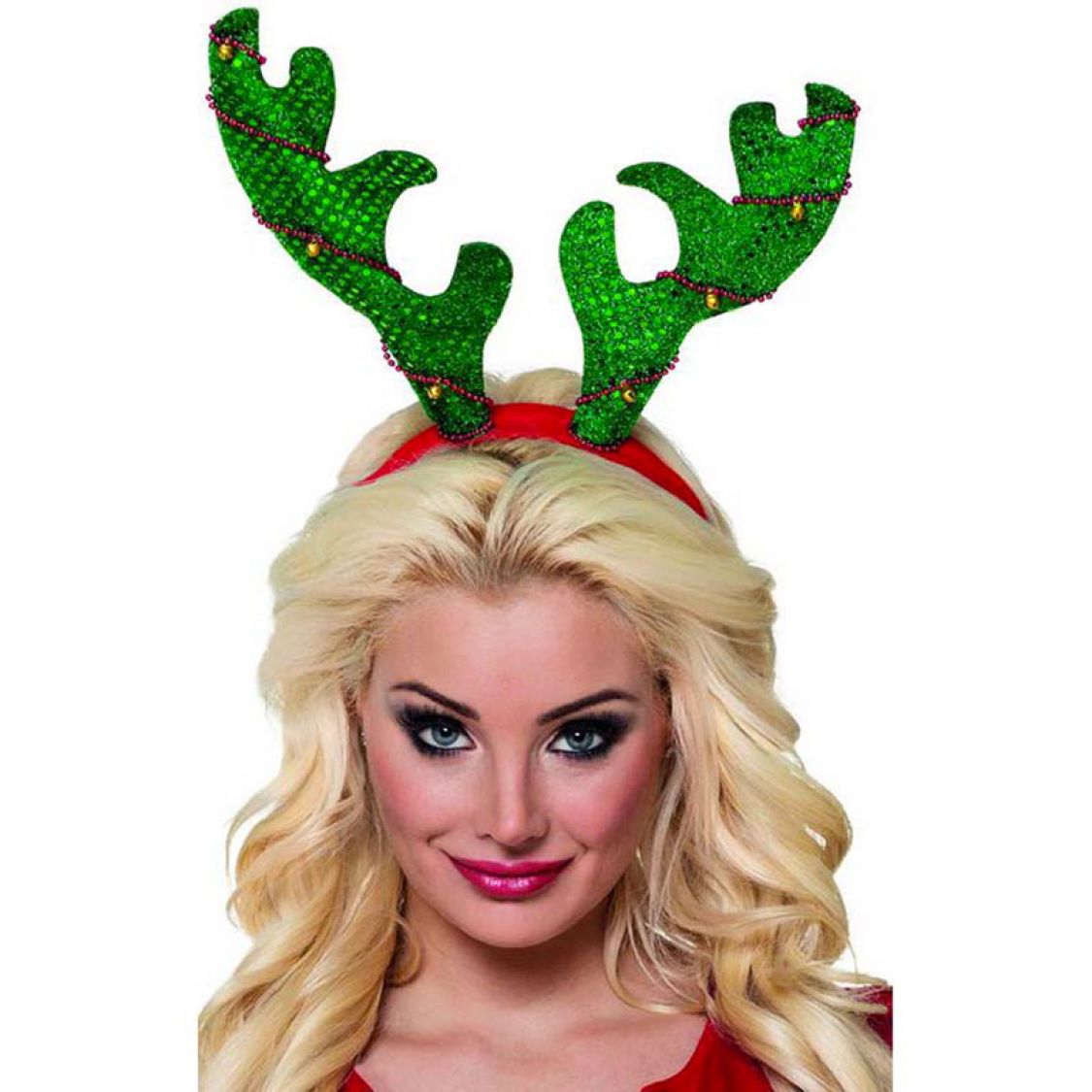 Nous vous proposons ce Serre tête Renne à porter durant toutes les fêtes de fin d'année. La base du serre tête est de couleur rouge, et dessus sont accrochées deux faux bois de renne de couleur verte, avec des paillettes sur le devant, et une mini guirlande rouge avec des grelots pour agrémenter le tout. Ce serre-tête de renne est pour adulte. Ce serre-tête noël sera parfait pour apporter une touche de fantaisie à votre tenue le soir de Noël.