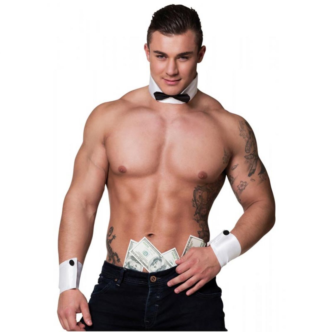 Ce set composé d'un col avec noeud papillon et d'une paire de poignets, vous permettra de vous transformer en chippendale, et de dévoiler tous vos charmes ! Brillez, dansez, séduisez !!