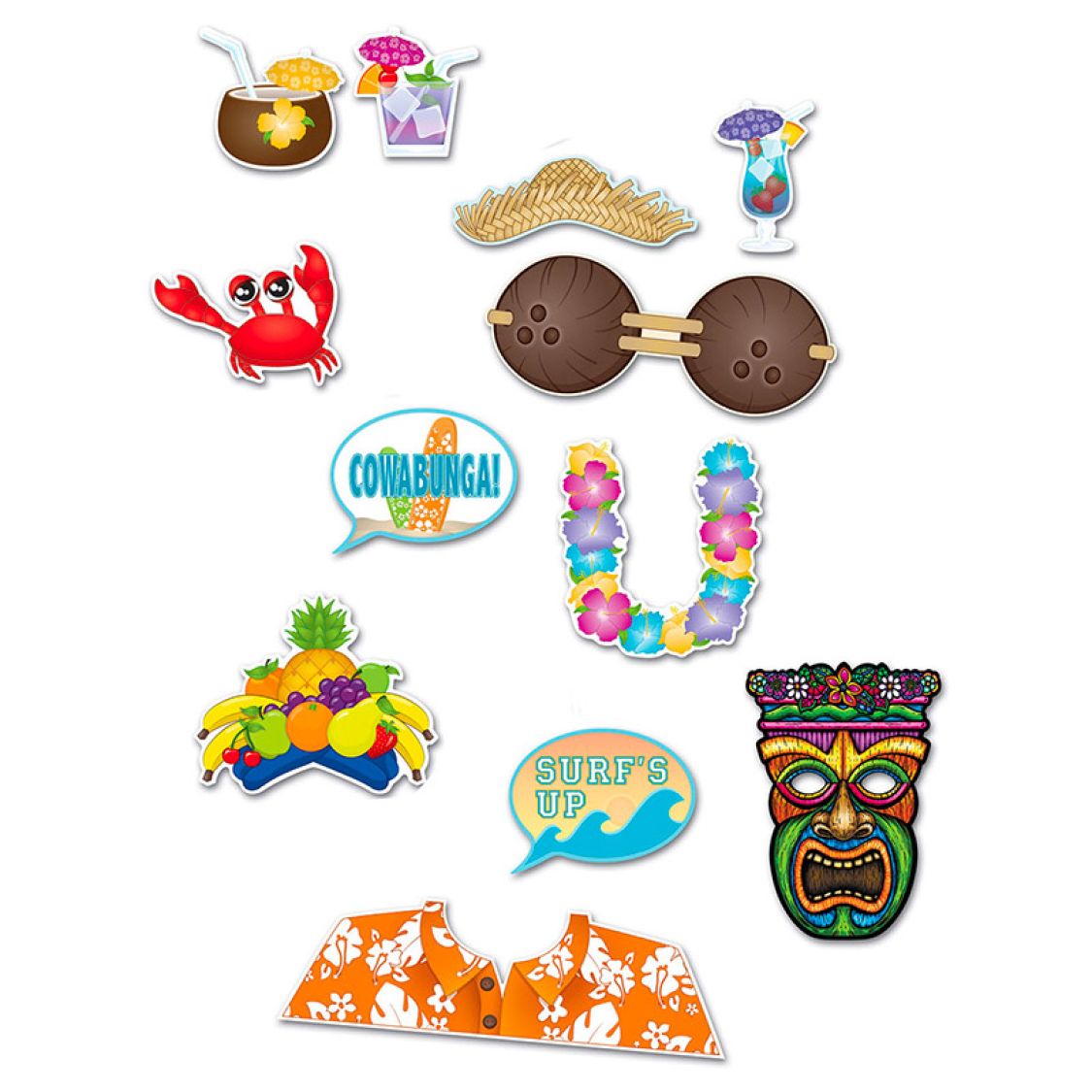 Conditionnement: Sachet de 12 pièces : 1 chapeau fruits, 1 haut de chemise hawaïenne, 2 bulles style BD, 2 coquillages attachés au recto et noix de coco au recto, 1collier en fleurs , 3 cocktails, 1 crabe, 1 chapeau de paille, 1 masque tiki