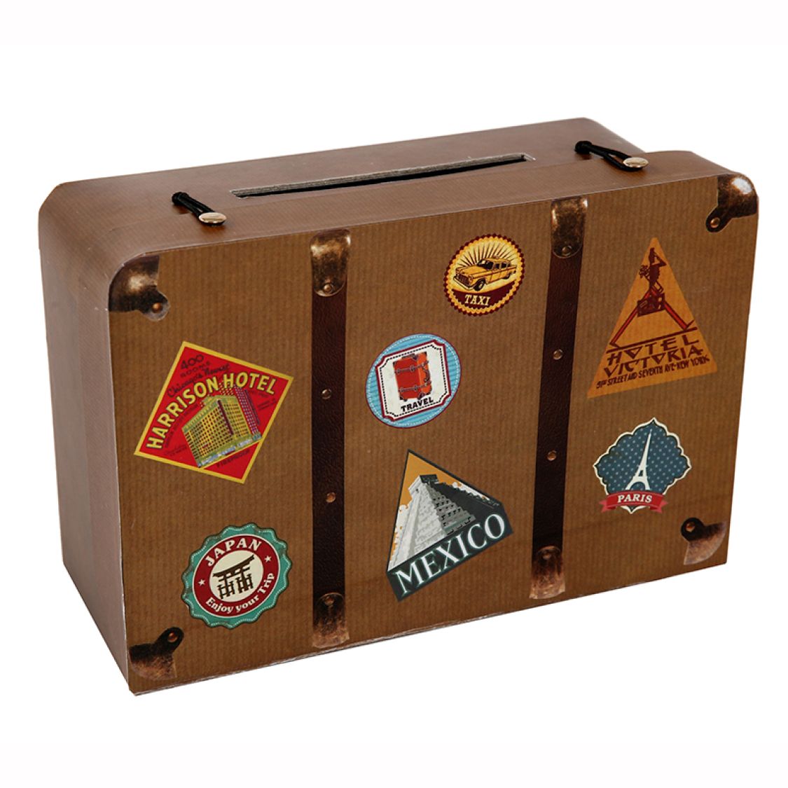 Superbe et Originale, voici une tirelire en carton marron en forme de malle de voyage qui permet à vos invités de déposer dans son urne centrale leurs enveloppes cadeau . Cette Tirelire Voyage pourra servir pour toutes occasions: Fiançailles, mariage, anniversaire, anniversaire de mariage, retraite, etc..