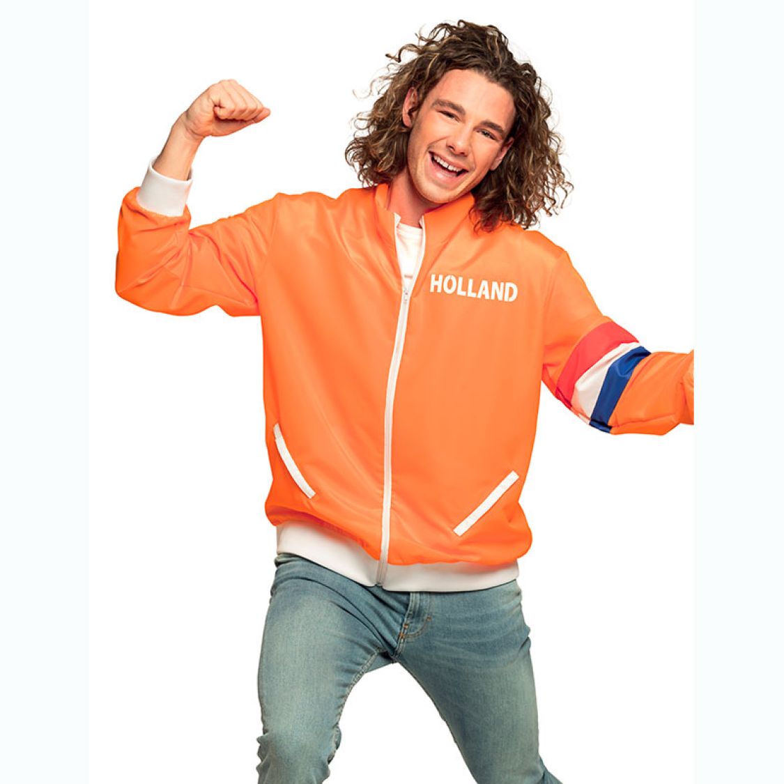Nous vous proposons cette veste supporter Hollandais Homme pour vous permettre de porter les couleur de la Hollande. Ce blouson orange de style bombers est réalisé dans un tissu orange à un effet satiné. Sur la poitrine, il y a l'une inscription blanche "Holland" et elle est décorée du drapeau Hollandais. Cette veste se ferme à l'aide d'une fermeture éclair de couleur blanche. Ce blouson Hollande sera votre principal allié pour jouer les supporters pendant toutes les compétitions sportives, ou pour assister aux manifestations nationales hollandaises